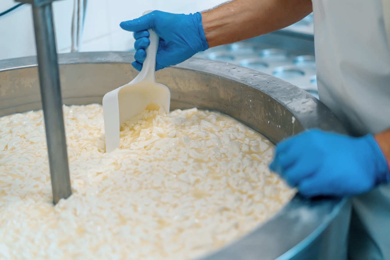 - milk mixing at cheese factory cheese maker checks cheese in large tank Pasteurization Cheese production cheese factory