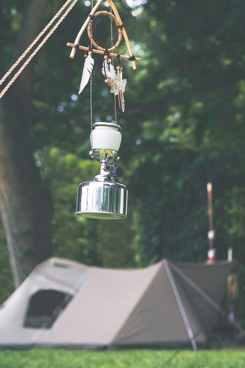 - Vintage hanging lantern and dreamcatcher with blurred field tent in campsite area at natural parkland